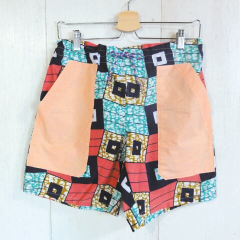 パーニュという西アフリカで使われているカラフルなプリント生地で作ったショートパンツ。