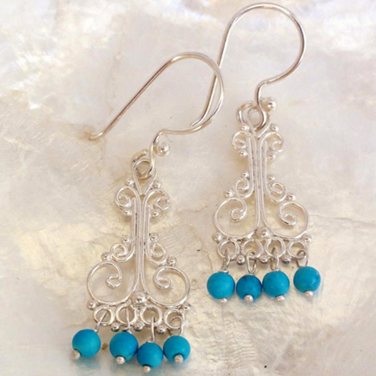 小さなターコイズのパーツが揺れる素敵なピアス。ターコイズは旅のお守り、幸運や繁栄をもたらすと言われております。