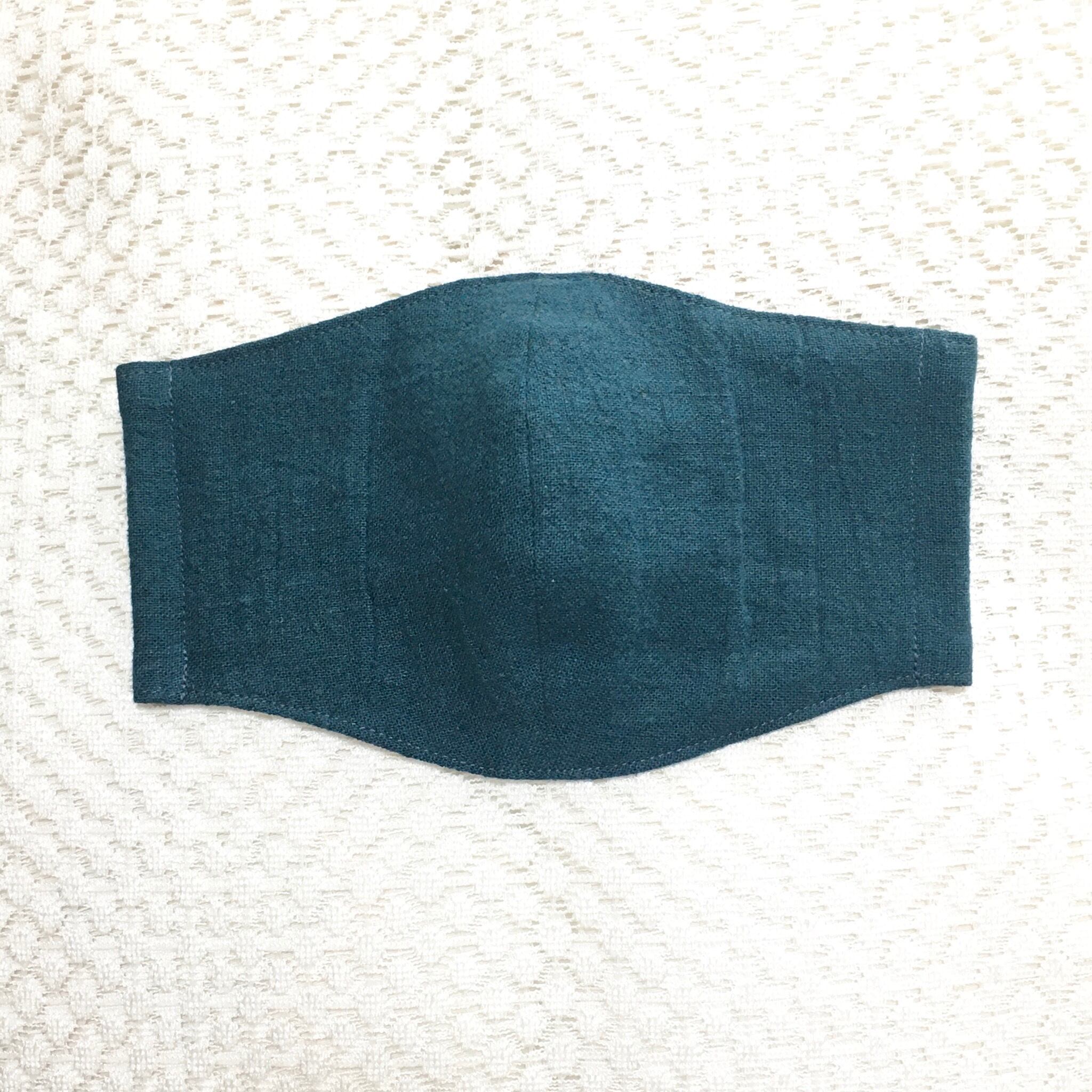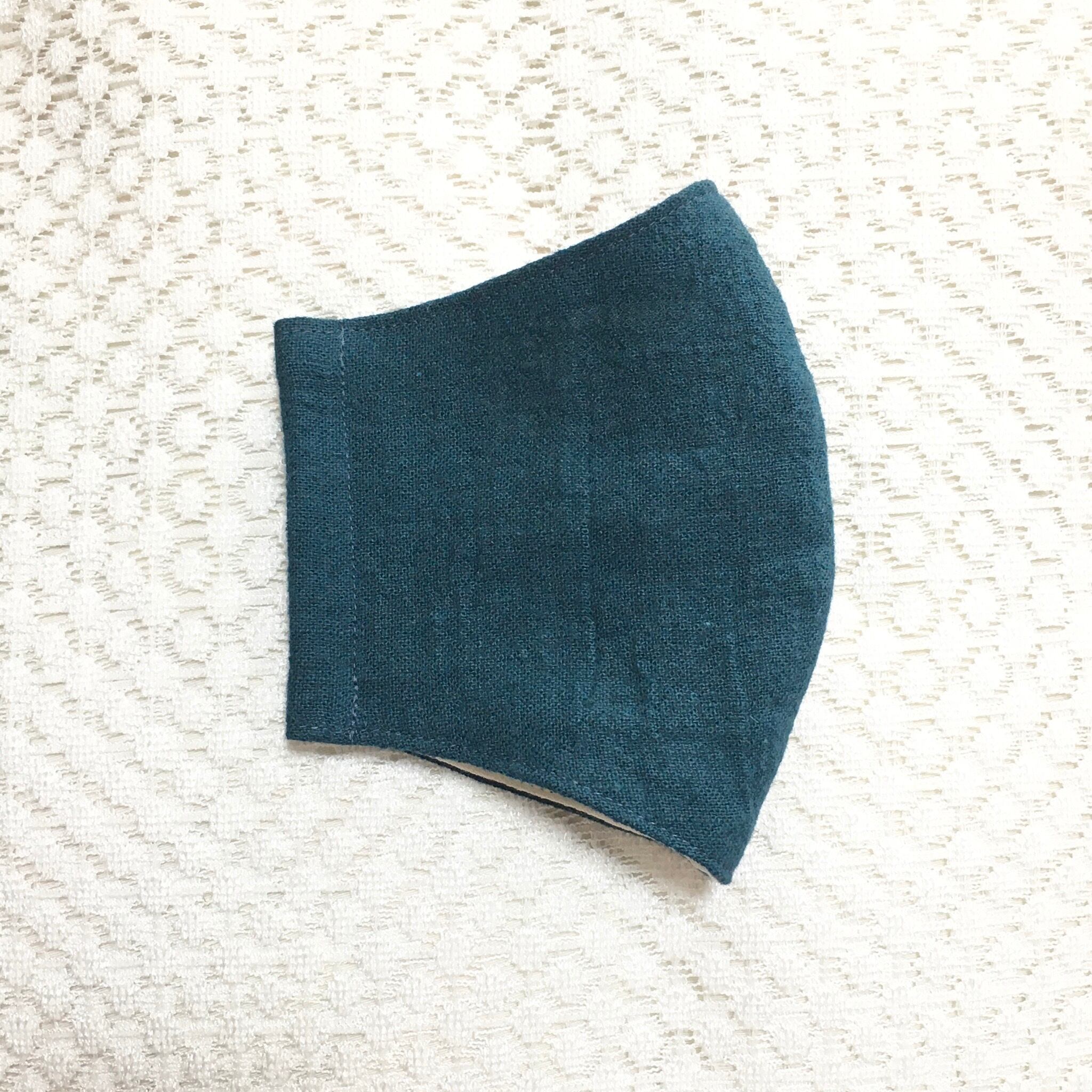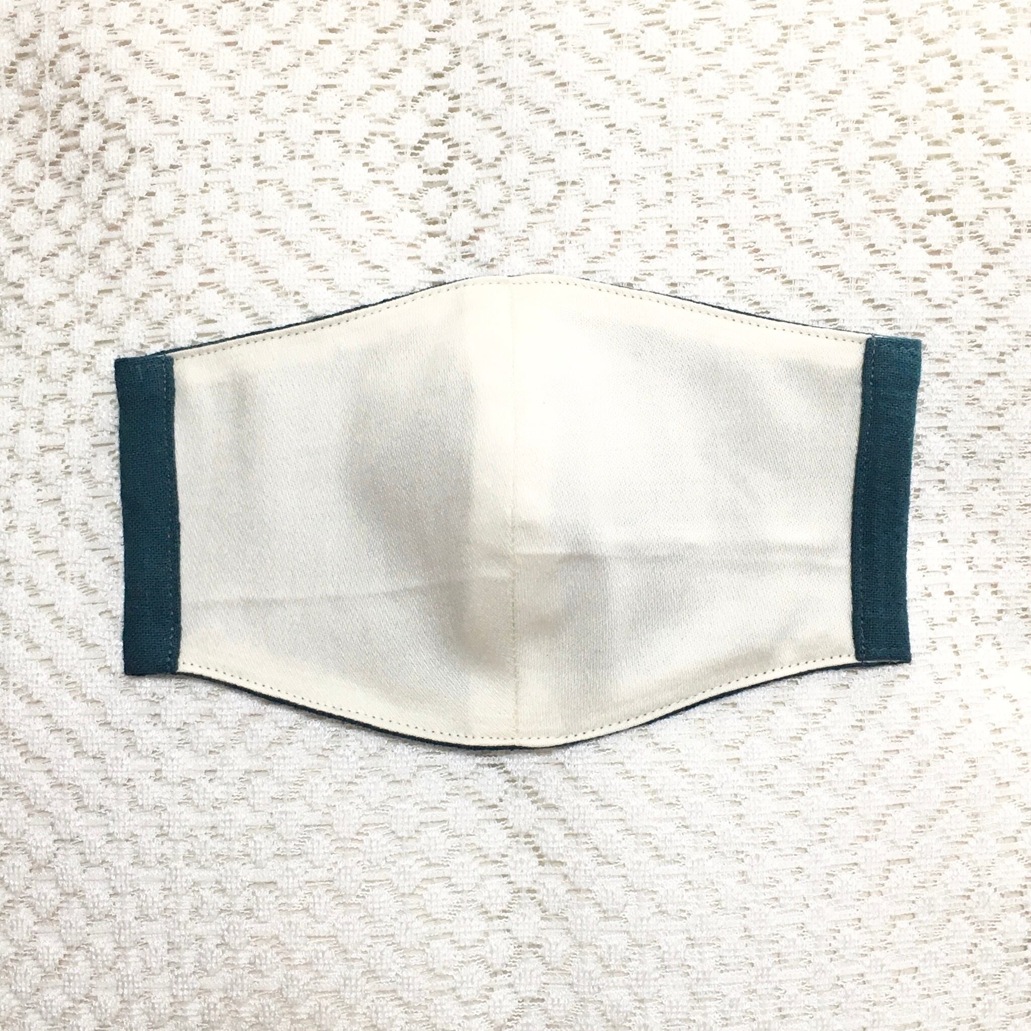 表面はブルーグリーンの綿麻、裏面はオフホワイトのオーガニックコットン100%を使用しています。布マスク43と色味は似ていますが、比べるとこちらの布マスク75の方が緑がかった感じです。