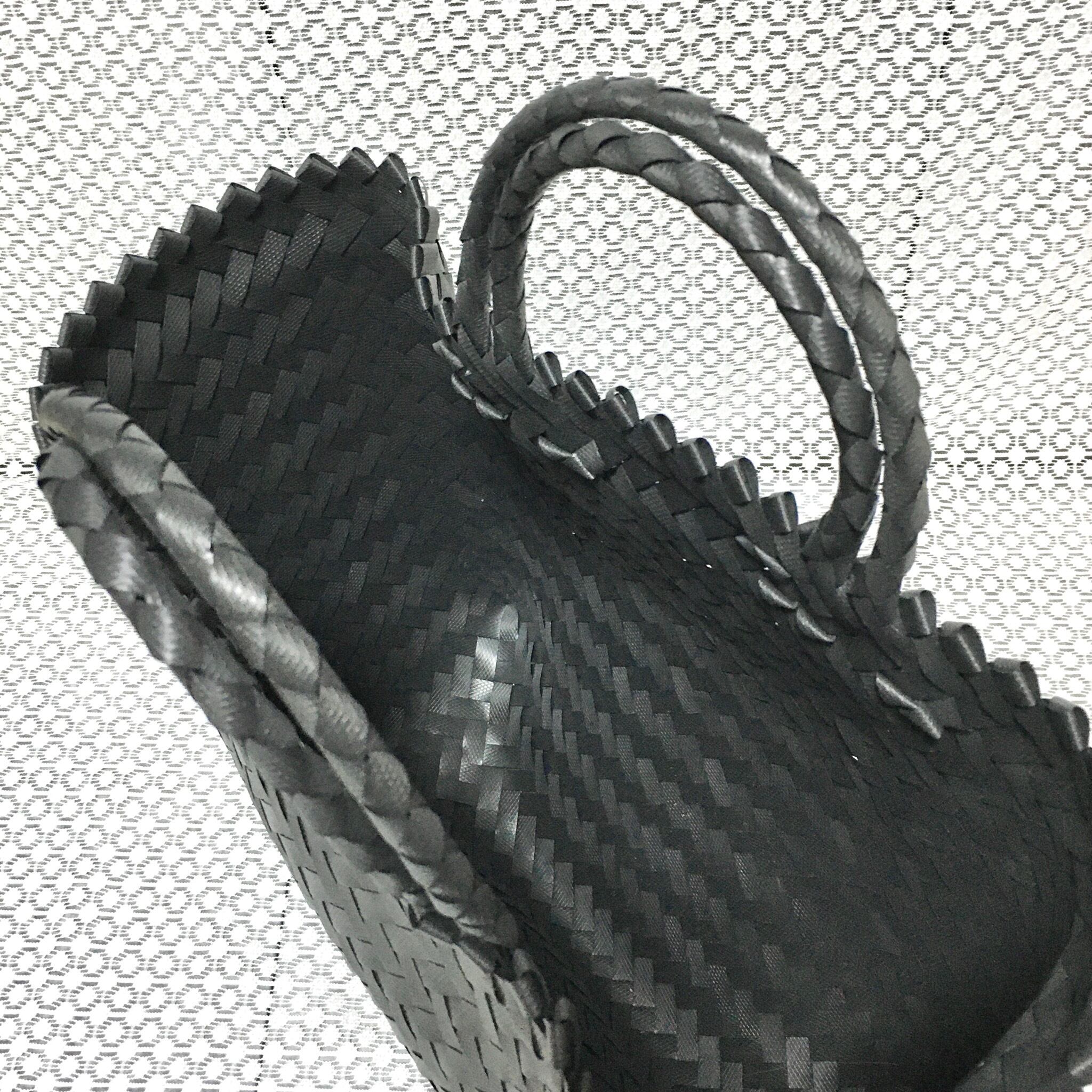 リサイクル素材のテープを手編みして作られた