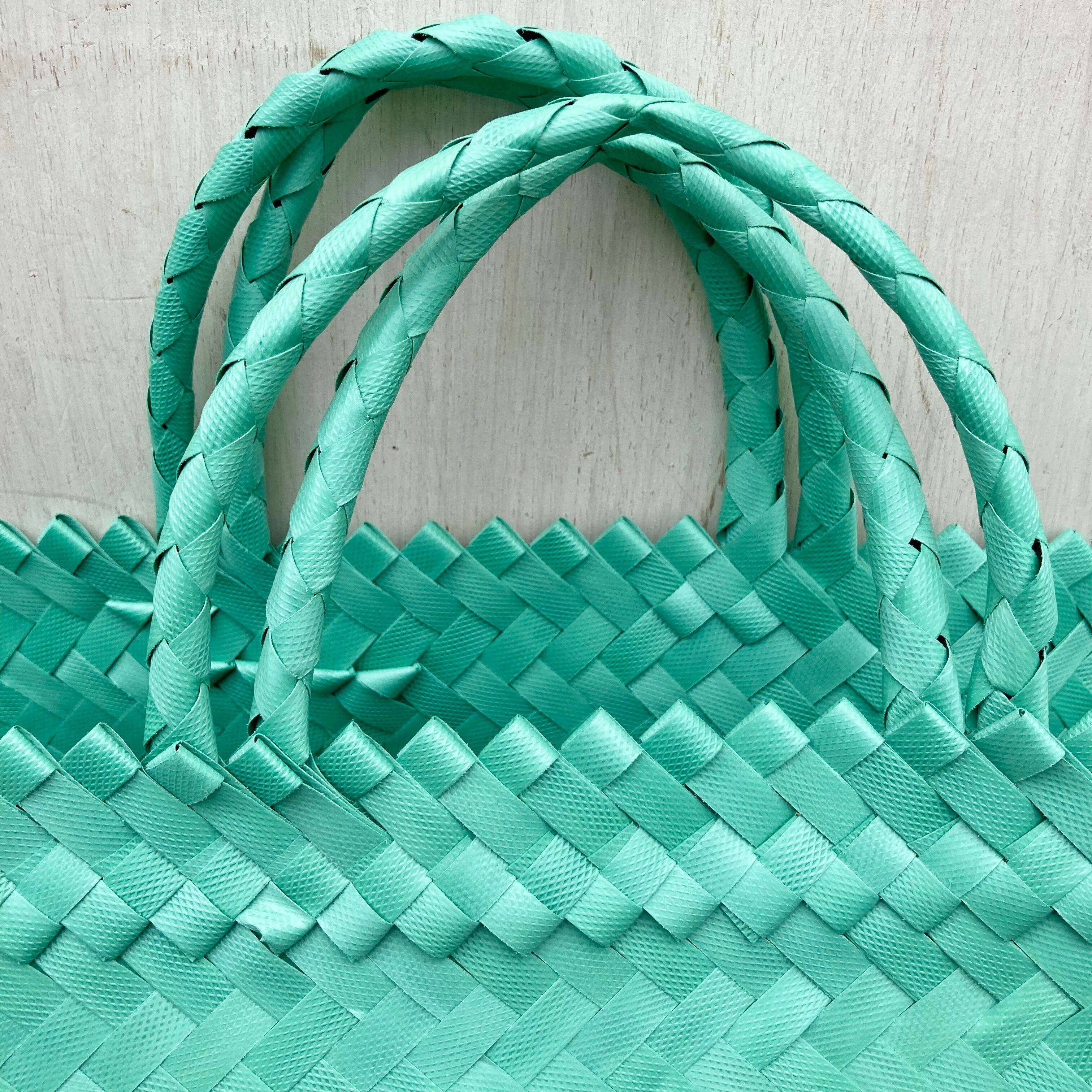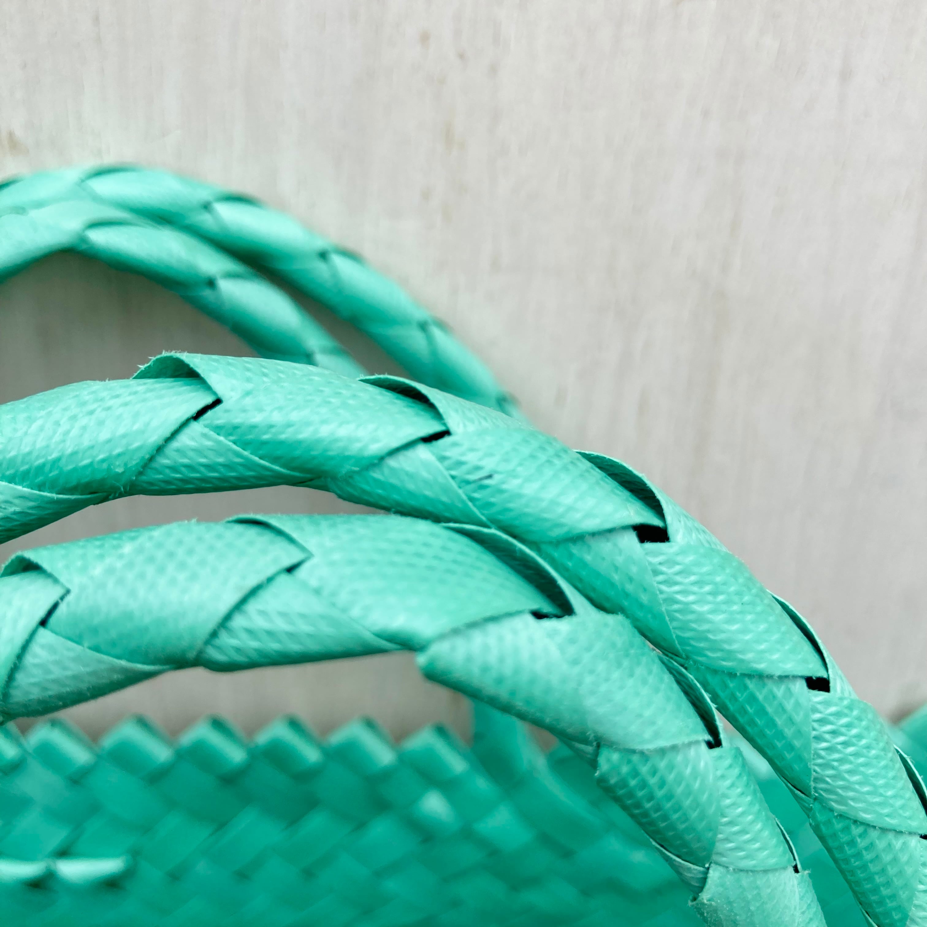 リサイクル素材のテープを手編みして作られた