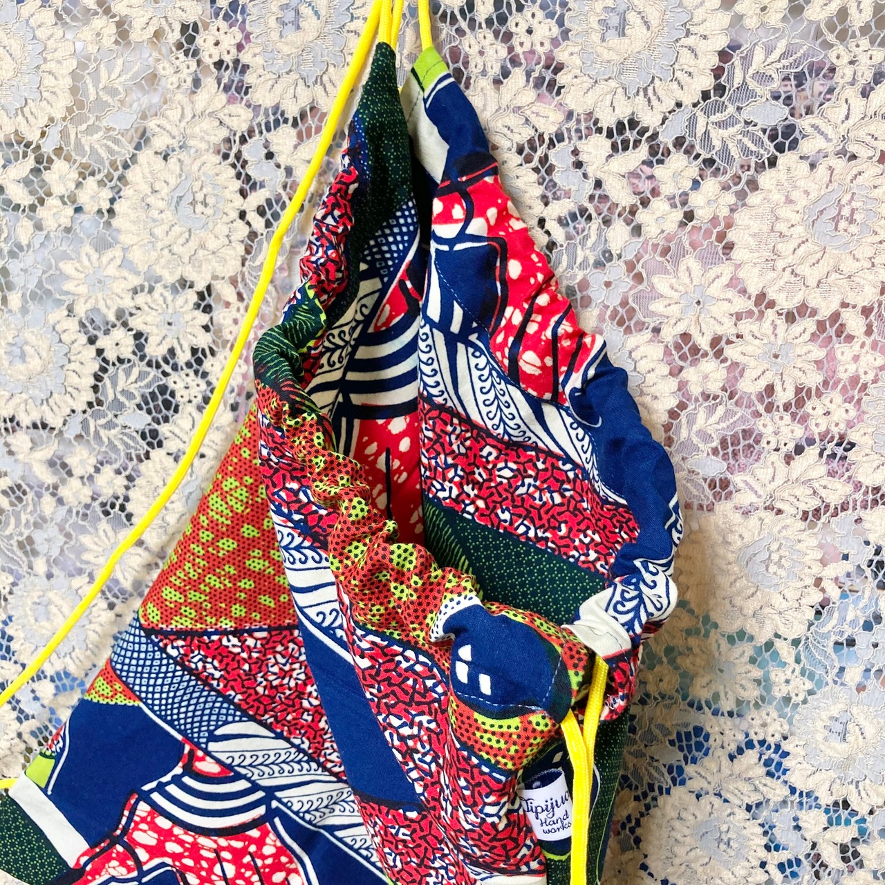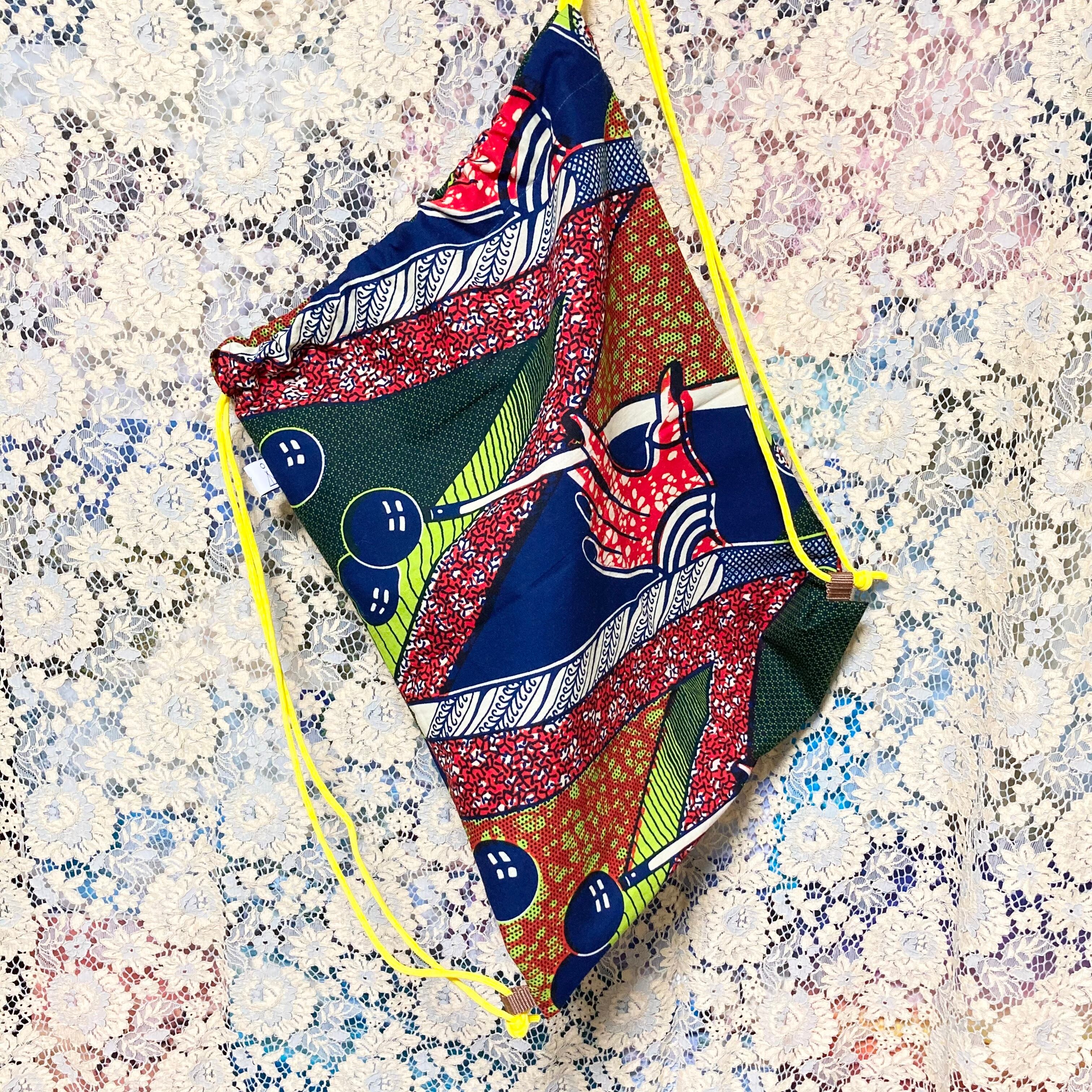 カラフルなアフリカンファブリックのナップサック。ビリヤード柄です。
