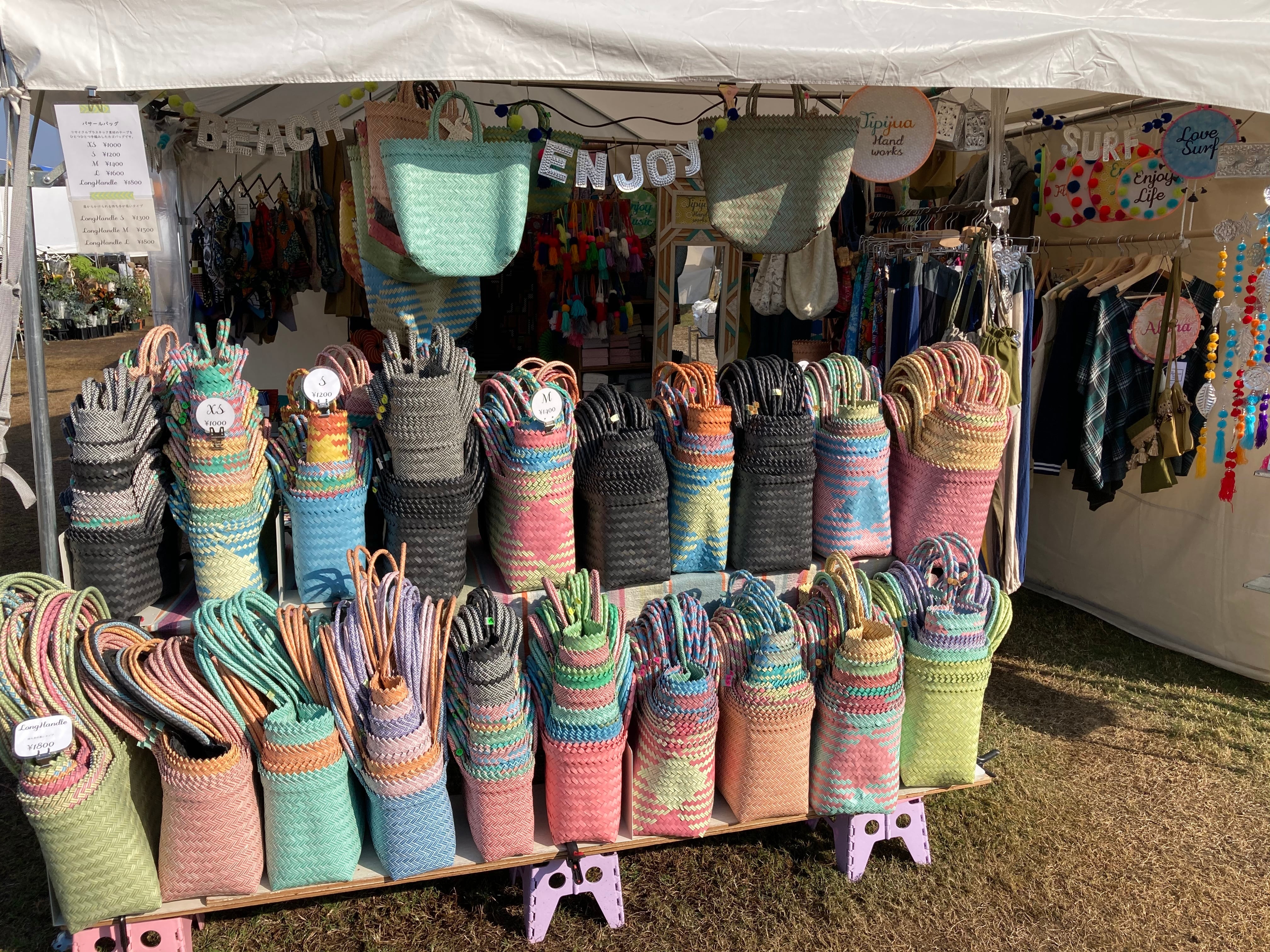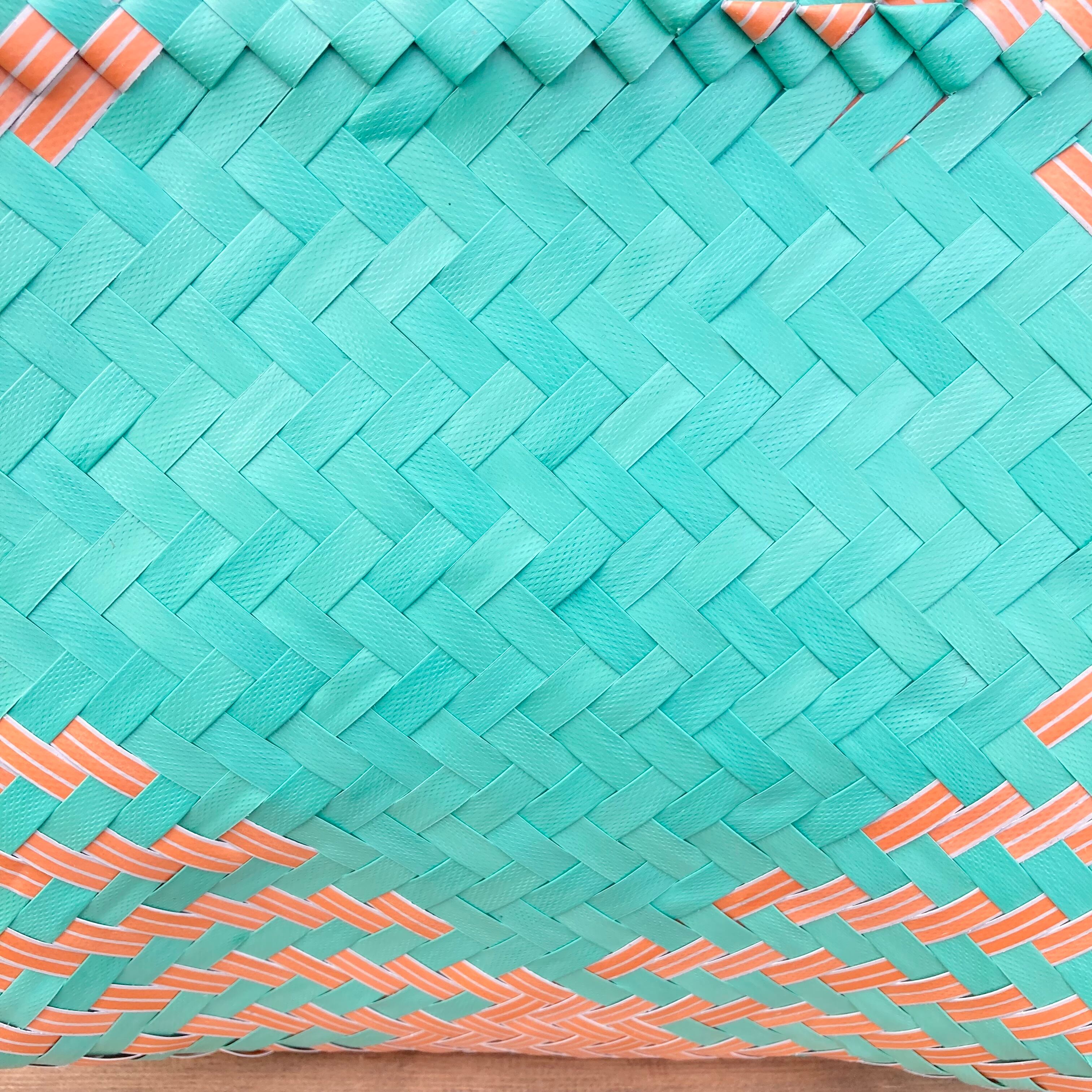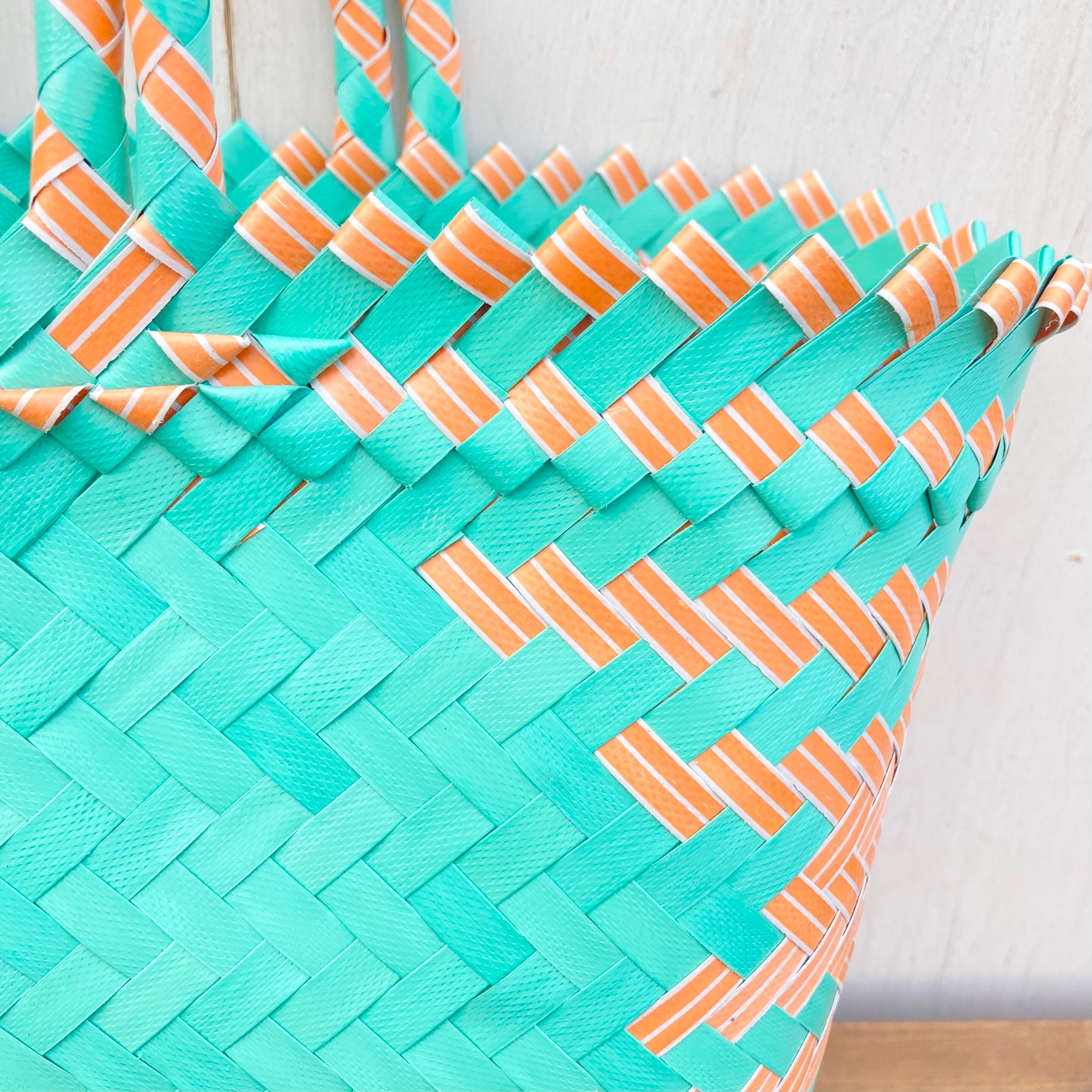 リサイクル素材のテープを手編みして作られた