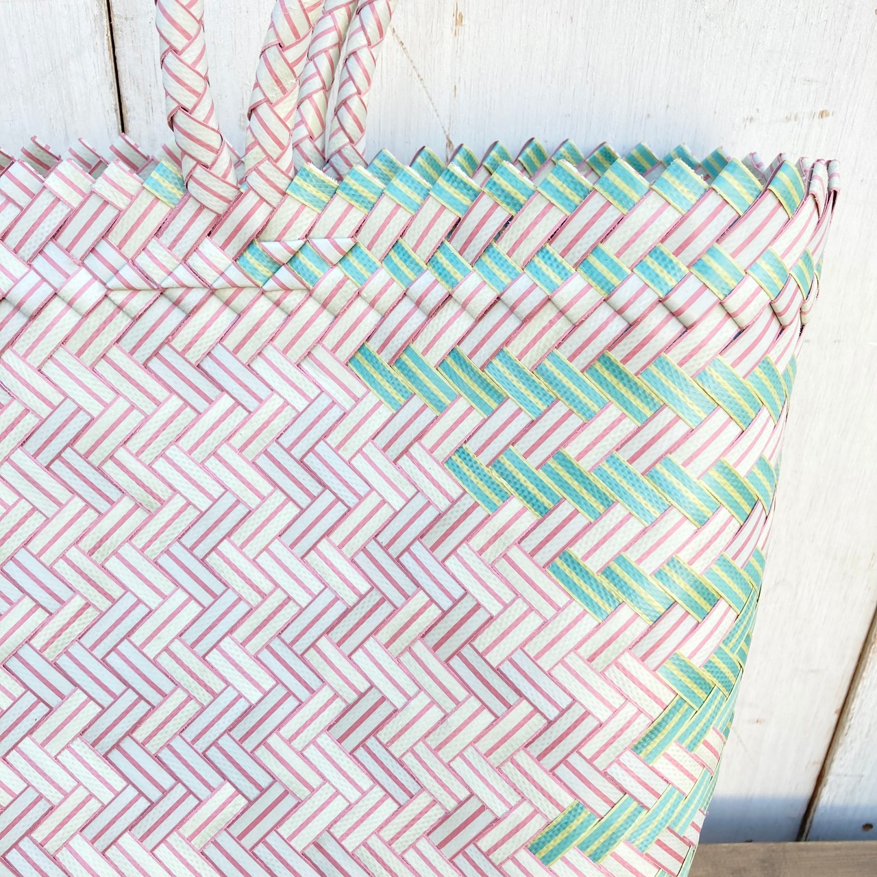 リサイクル素材のテープを手編みして作られた