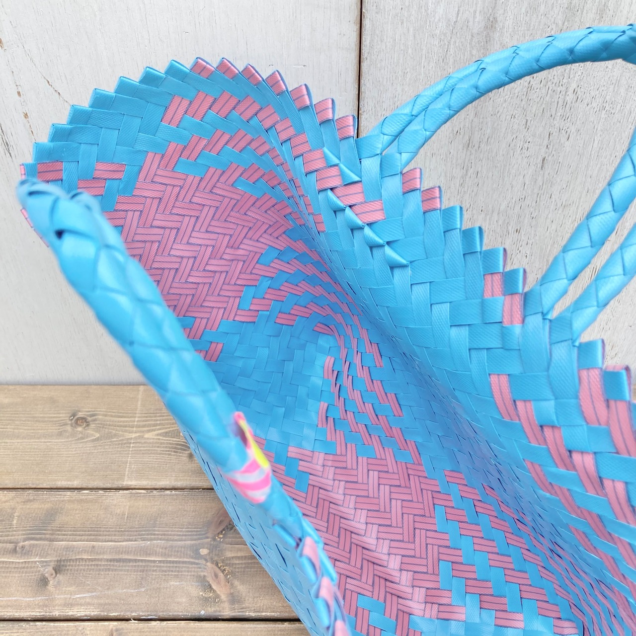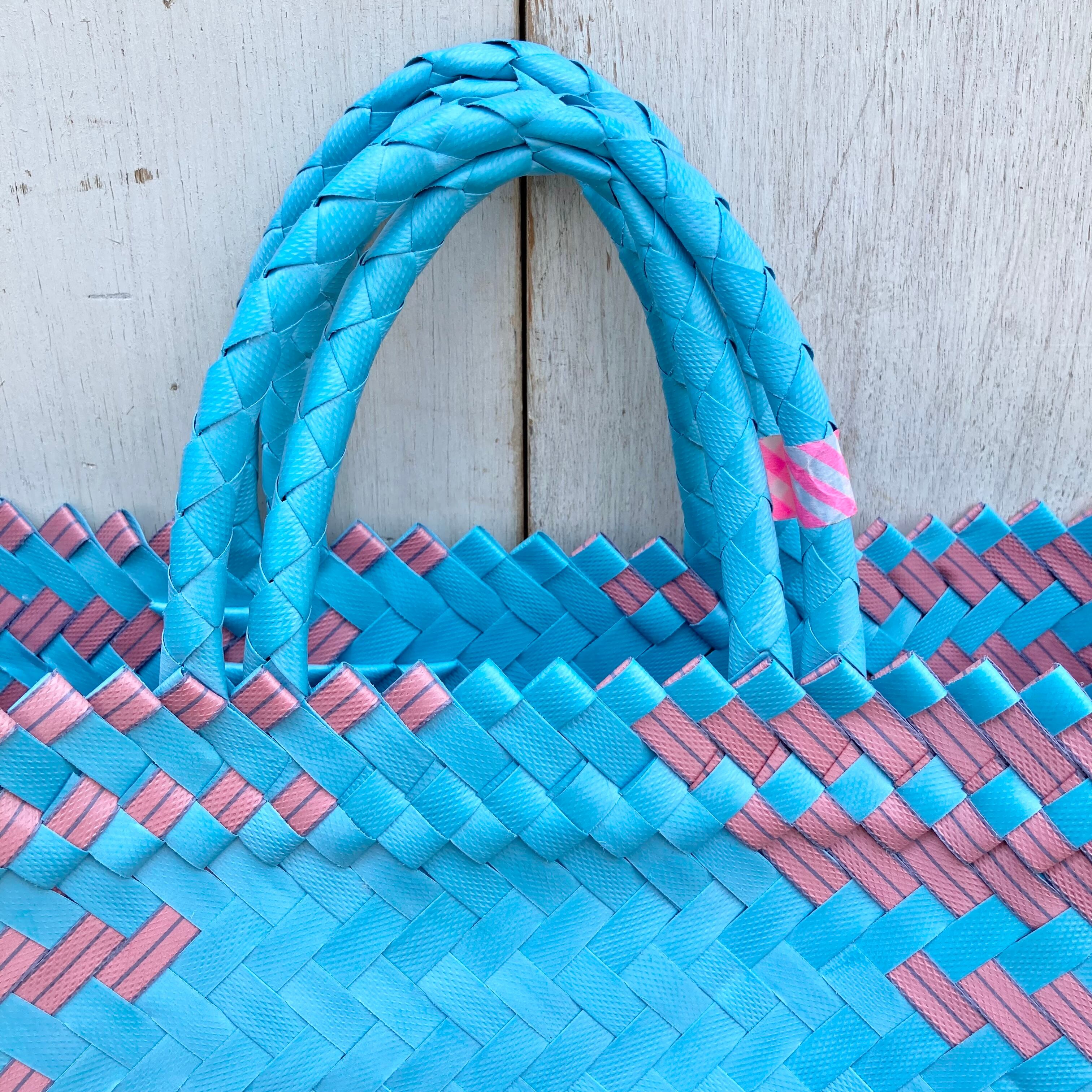 リサイクル素材のテープを手編みして作られた