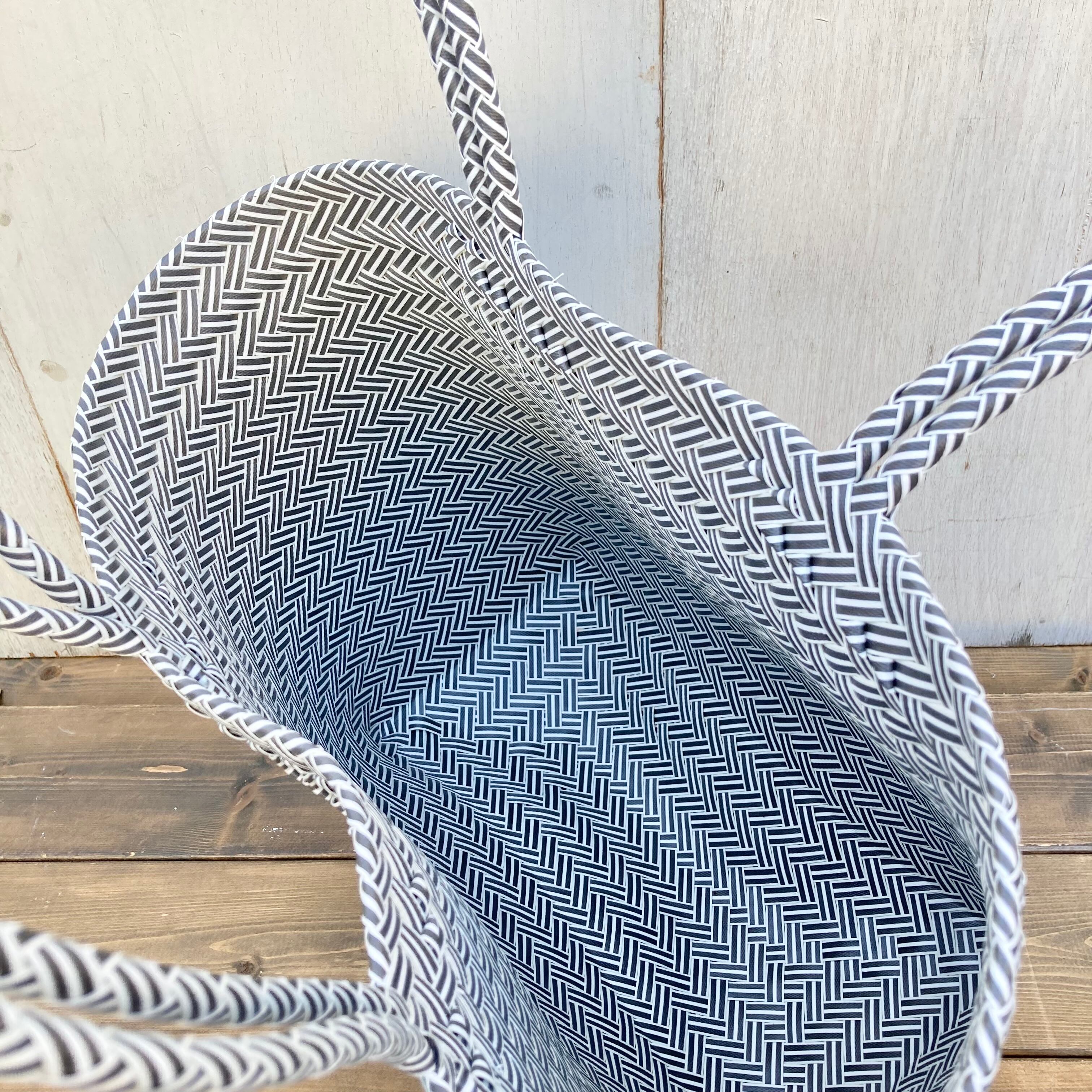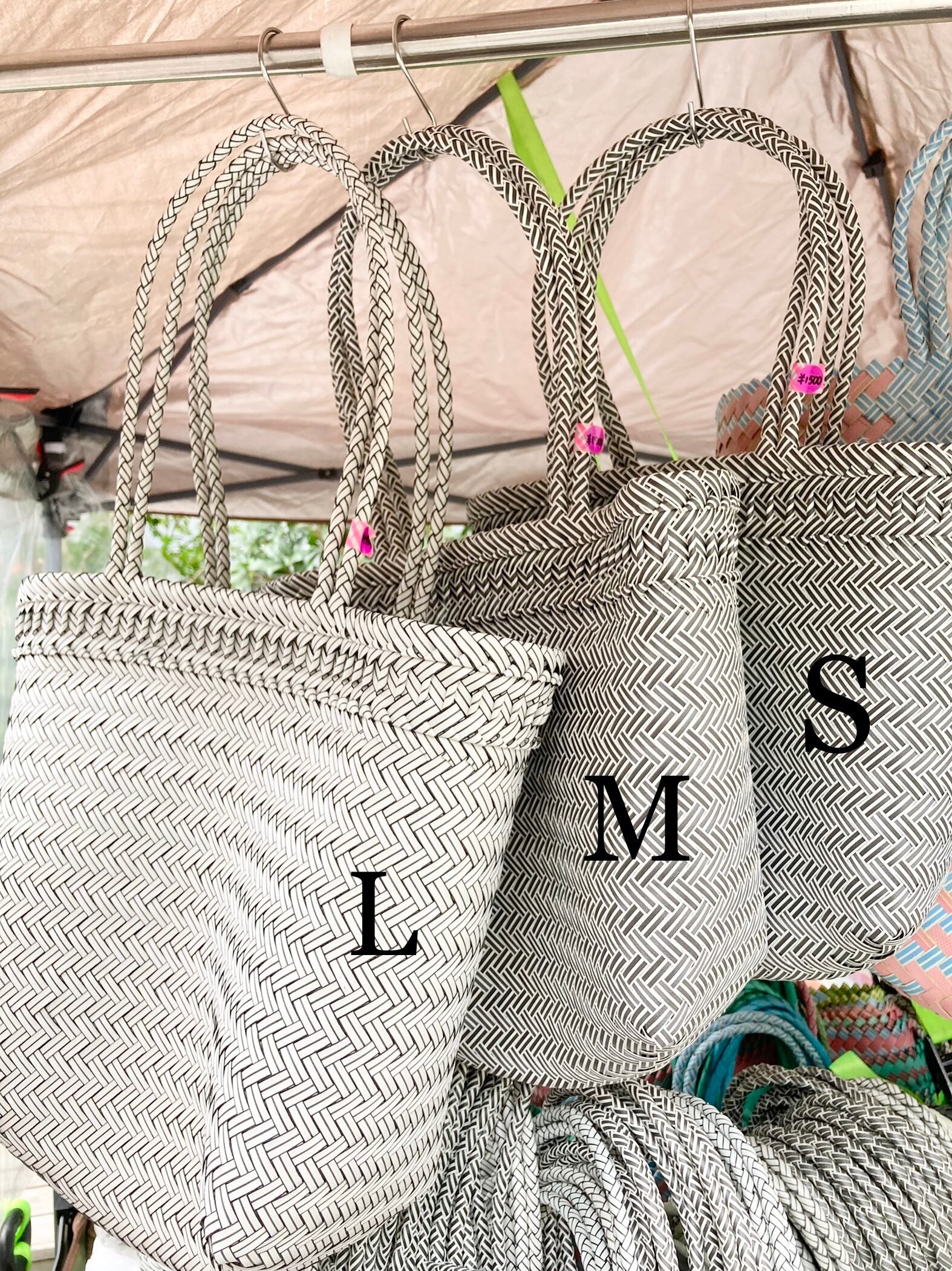 リサイクル素材のテープを手編みして作られた