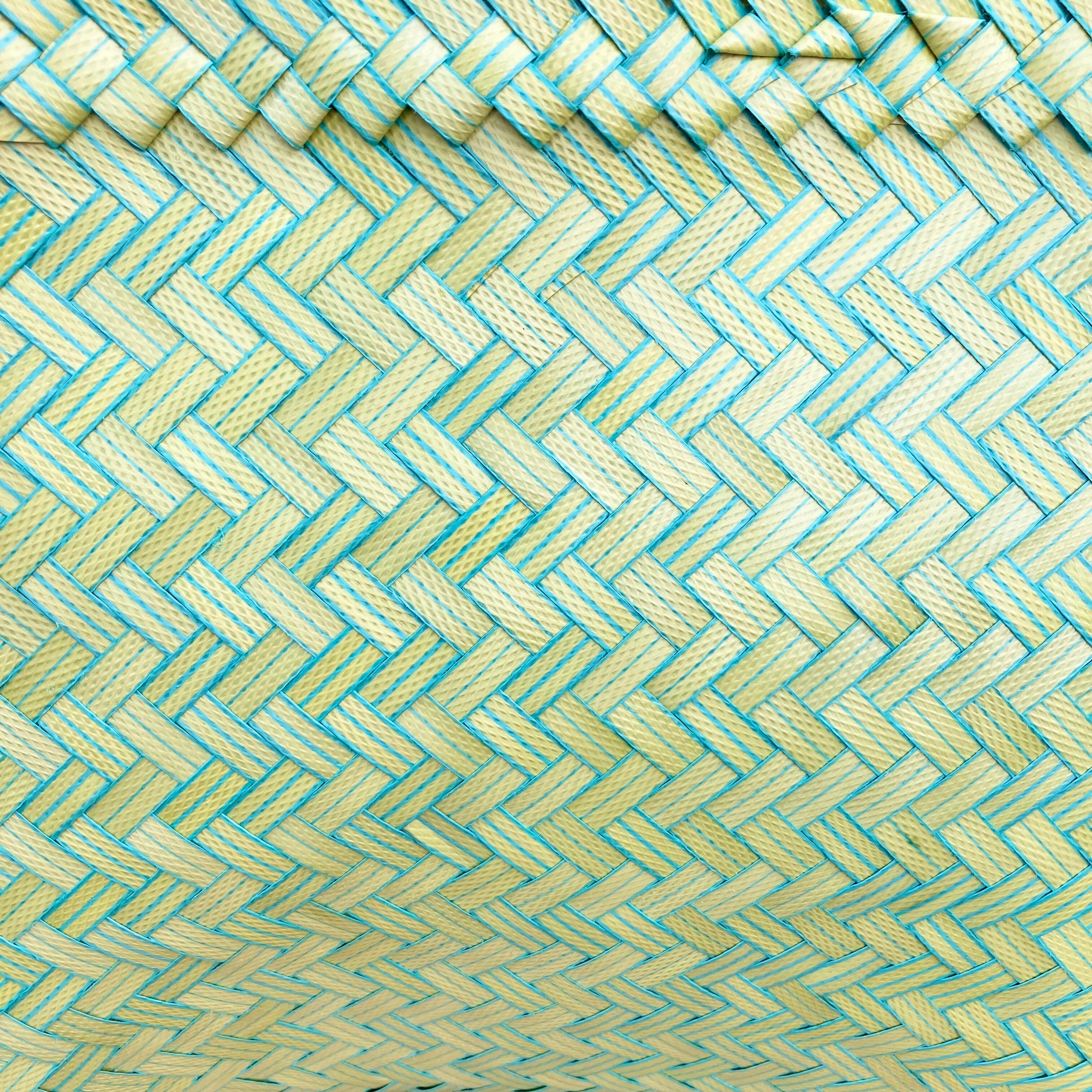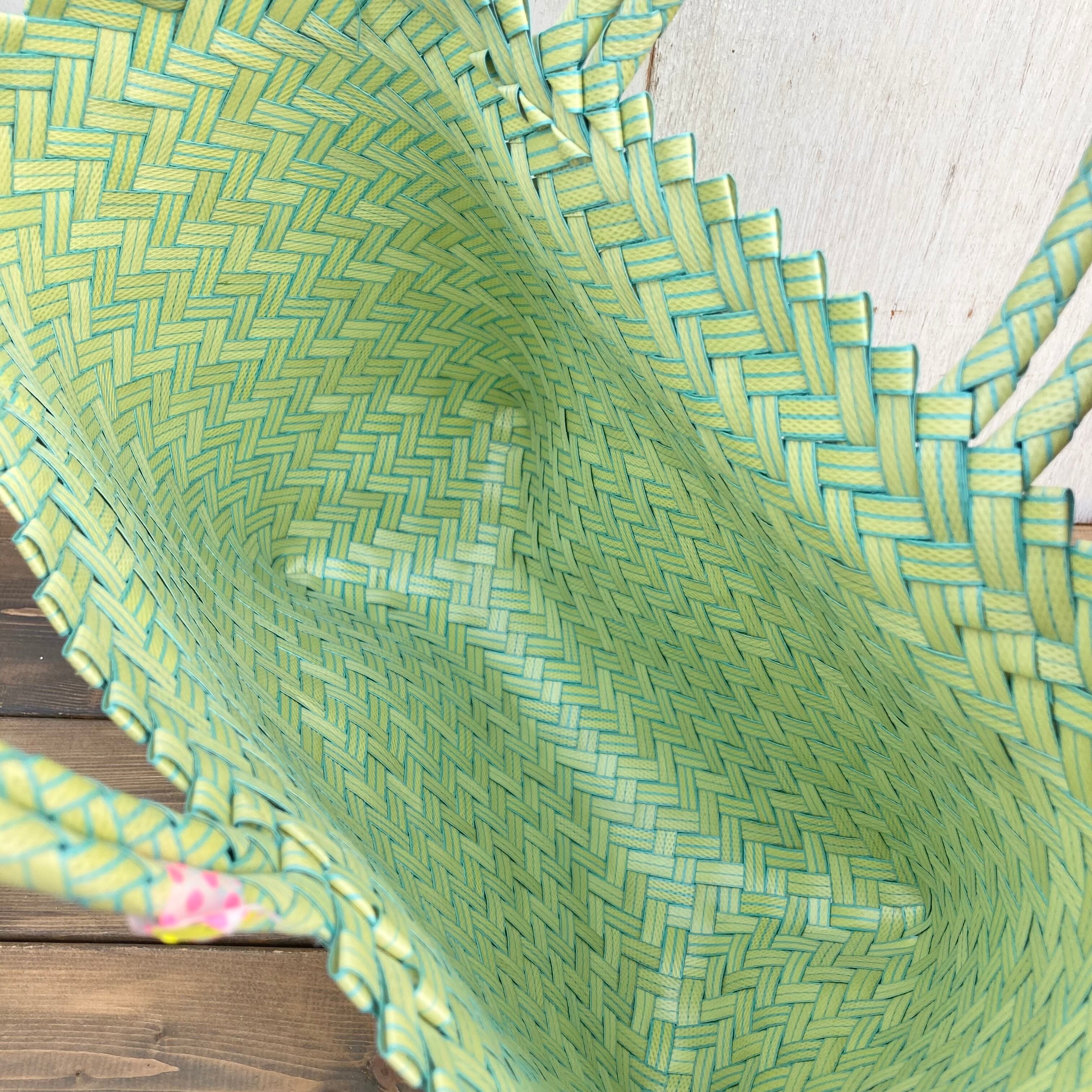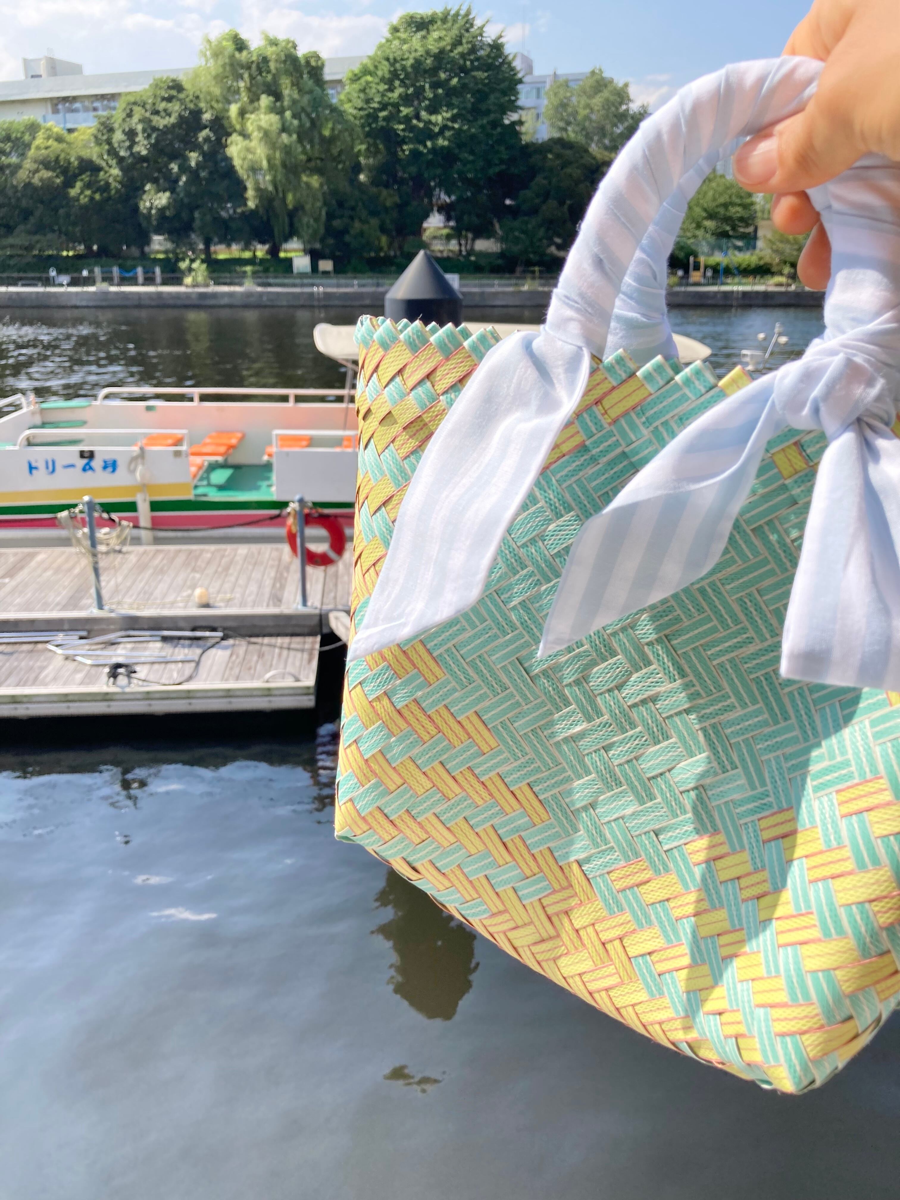リサイクル素材のテープを手編みして作られた
